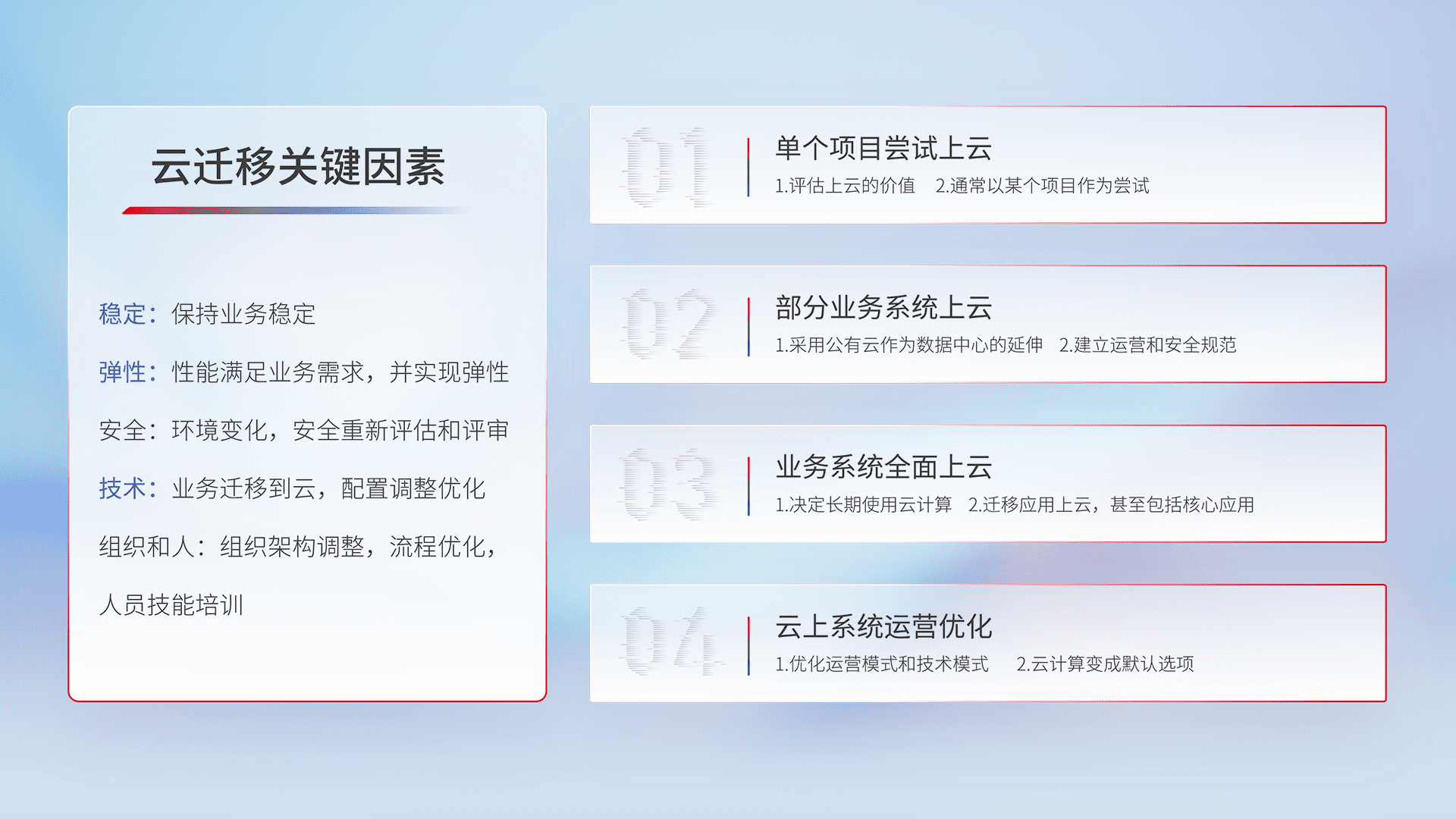 结合实际业务,,,,从规划设计、、云平台选型、、、、云原生改造、、、数据迁移、、、、集成交付,,迁移全过程为客户识别最佳上云路径,,,做好风险识别管理,,,设计网络架构、、身份权限、、、安全审计合规、、、、操作审计、、、日志审计、、、监控告警策略、、多站点容灾设计等,,,对云上基础设施进行整体规划,,提升IT治理水平,,,,以满足弹性、、高可用、、高性能的需求。。。。