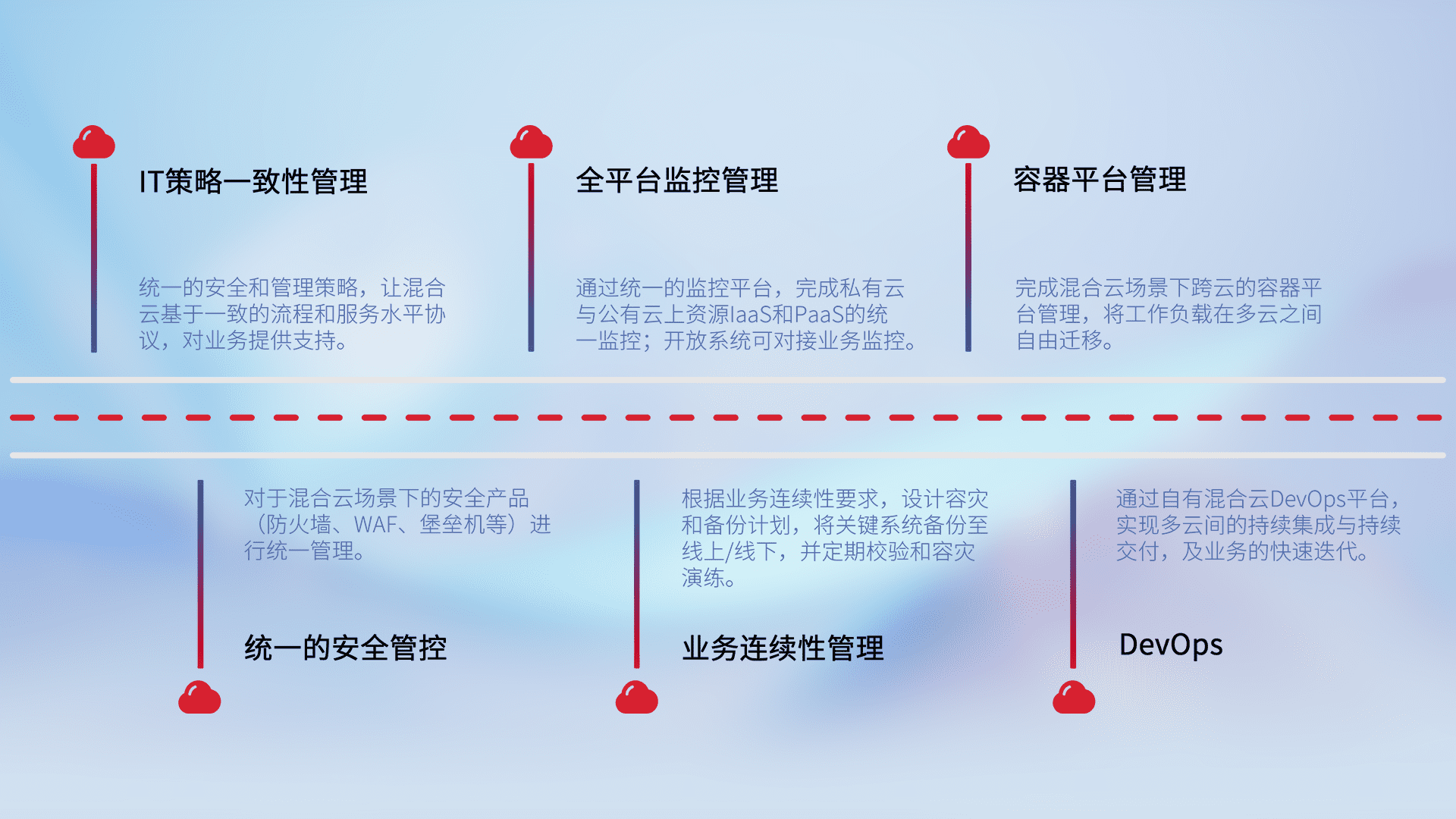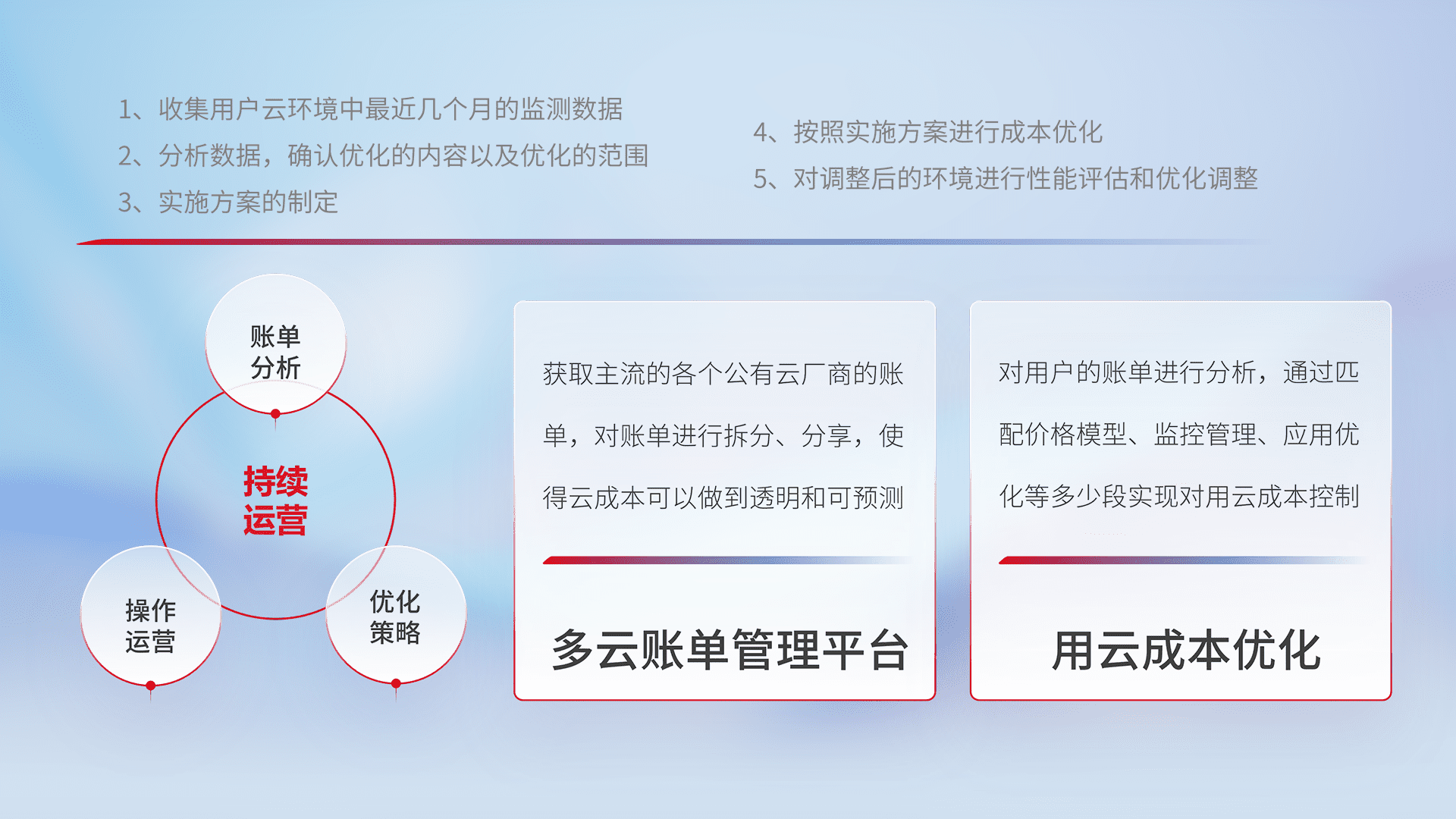 通过多云纳管,,,,以统一的资源数据模型把客户的云资源进行抽象和封装,,进而实现对多云资源的统一操作,,保障云资源管理的可靠性、、稳定性与可用性。。。。量身定制化运维内容,,,配置、、、、开发运维、、补丁管理、、、、备份、、监控、、、、认证和访问管理、、审计和日常巡检等,,,保障在用云过程中的可靠度,,,,稳定度以及高可用率。。。。