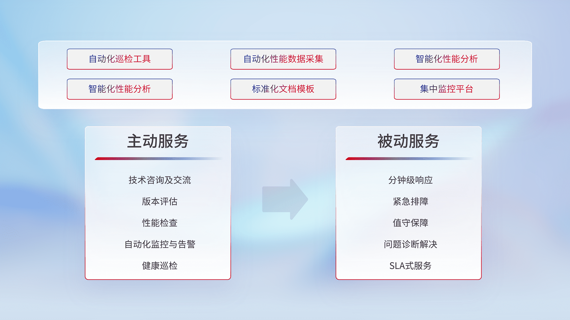 智能化工具和标准化文档,,保障服务质量,,提供主动服务(包含技术咨询、、、版本评估、、性能检查、、自动化监控与告警、、、健康巡检)和被动服务包含(分钟级响应、、、、紧急排障、、、值守保障、、、、问题诊断解决、、SLA服务)。。。